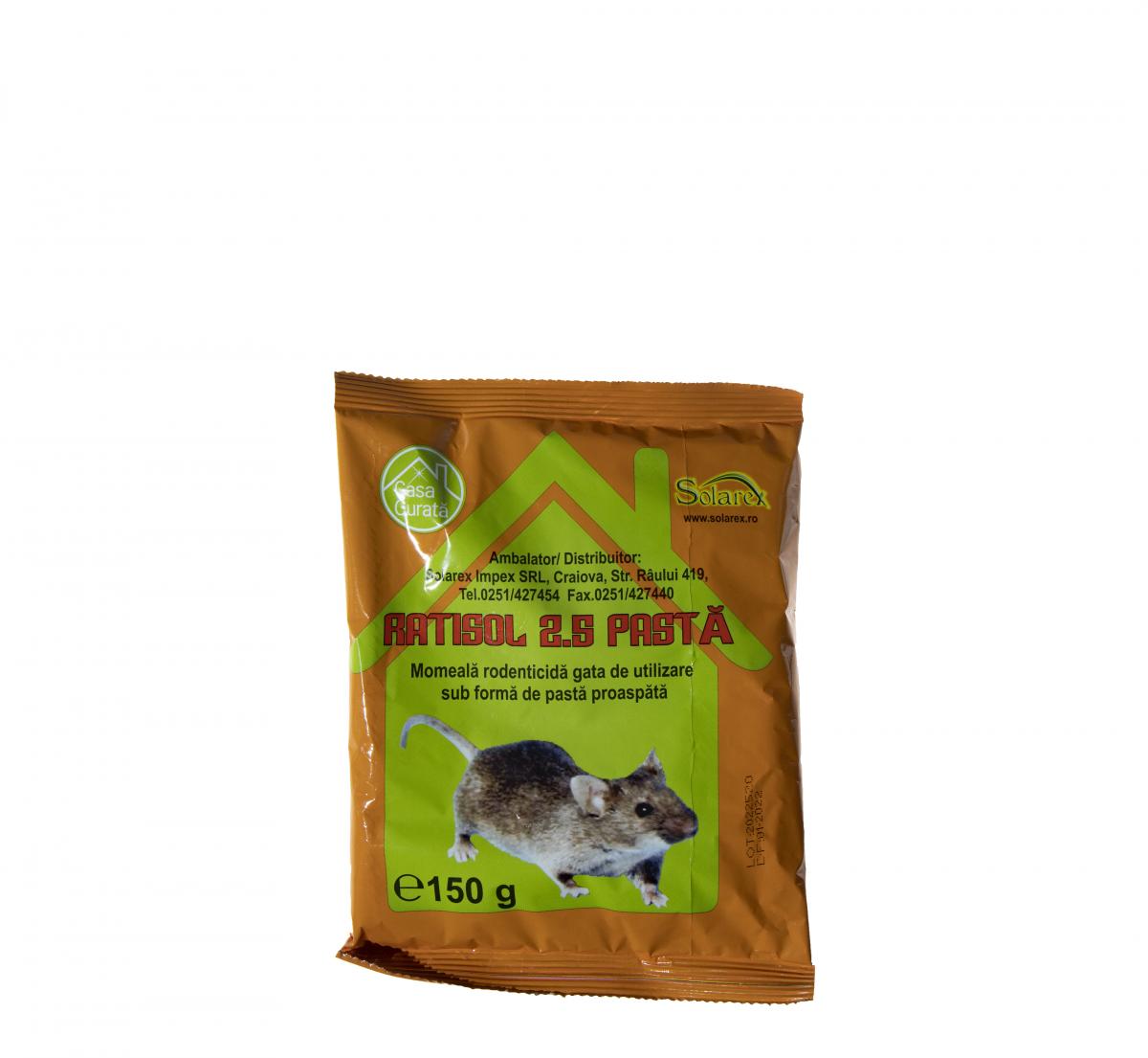 DOZE ȘI MOD DE UTILIZARE: Utilizarea în interiorul clădirilor pentru controlul Șoarecelui de casă (Mus musculus): Aplicați 20-40 g de momeală RATISOL 2.5 PASTA în recipient (stația de intoxicare), egală cu 2-4 momeli pastă proaspătă pentru pliculețele care cântăresc 10 g fiecare. În cazul în care avem o suprafaţă mai mare și sunt necesare mai multe containere ( statii de intoxicare), acestea se plasează la o distanță de aproximativ 10-15 metri unul de celălalt dar în orice caz nu la mai puțin de 5 metri. Containerele trebuie inspectate la fiecare 2-3 zile la începutul tratamentului și apoi cel puțin săptămânal. Acest lucru este de a verifica integritatea containerului, consumul de momeală, și, eventual, pentru a elimina carcasele rozătoarelor. Când este necesar, completați momeala. Utilizarea în interiorul clădirilor pentru controlul Șobolanului cenușiu (Rattus norvegicus): Aplicați 100-200 g de RATISOL 2.5 PASTA egală cu 10-20 momeli pastă proaspătă pentru pliculețele care cântăresc 10 g fiecare.În cazul în care avem o suprafaţă mai mare și sunt necesare mai multe containere, acestea se plasează la o distanță de aproximativ 10-15 metri unul de celălalt dar în orice caz nu la mai puțin de 5 metri. Recipientele trebuie inspectate la fiecare 5-7 zile la începutul tratamentului și apoi cel puțin săptămânal. Acest lucru este de a verifica integritatea containerului, consumul de momeală, și, eventual, pentru a elimina carcasele rozătoarelor. Când este necesar, completați momeala. Utilizarea în exteriorul clădirilor pentru controlul Șobolanului cenușiu (Rattus norvegicus): Aplicați 100-200 g de RATISOL 2.5 PASTA egală cu 10-20 momeli pastă proaspătă pentru pliculețele care cântăresc 10 g fiecare. În cazul în care avem o suprafaţă mai mare și sunt necesare mai multe containere, acestea se plasează la o distanță de aproximativ 10-15 metri unul de celălalt dar în orice caz nu la mai puțin de 5 metri. Poziționați recipientele cu momeală în zone care nu sunt expuse inundațiilor. Înlocuiți momeala în recipiente dacă acestea sunt deteriorate de apă sau contaminate cu murdărie. Containerele cu momeli trebuie verificate cel puțin la fiecare 5-7 zile la începutul tratamentului și cel puțin săptămânal după aceea, pentru a verifica dacă momeala este acceptată, recipientele sunt intacte și pentru a scoate corpurile rozătoarelor. Umpleți recipientul când este necesar.