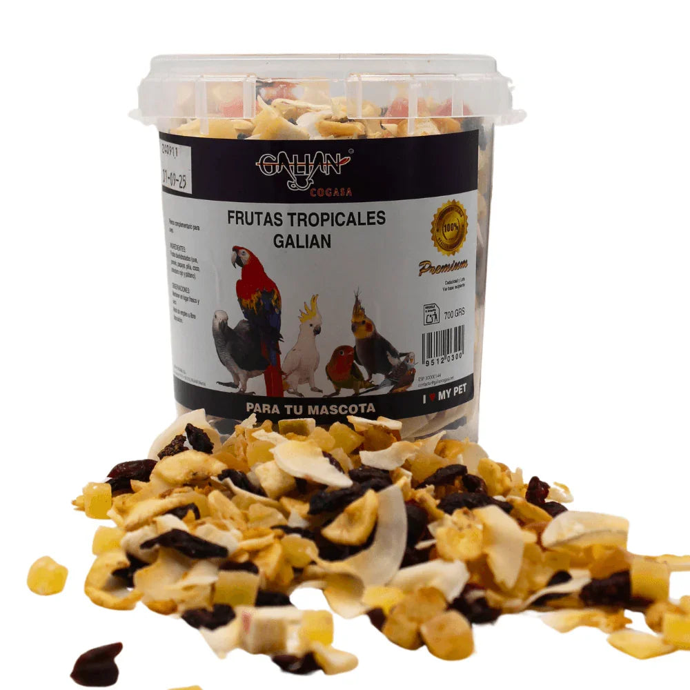 Mixul de fructe tropicale uscate 700 g este o combinație delicioasă și nutritivă de papaya, ananas, struguri, coacăze roșii, banane și nucă de cocos. Conceput pentru păsări exotice de colivie, acest produs adaugă varietate și prospețime în dieta zilnică, oferind vitamine, antioxidanți și energie. Ideal ca supliment alimentar sau tratament ocazional.